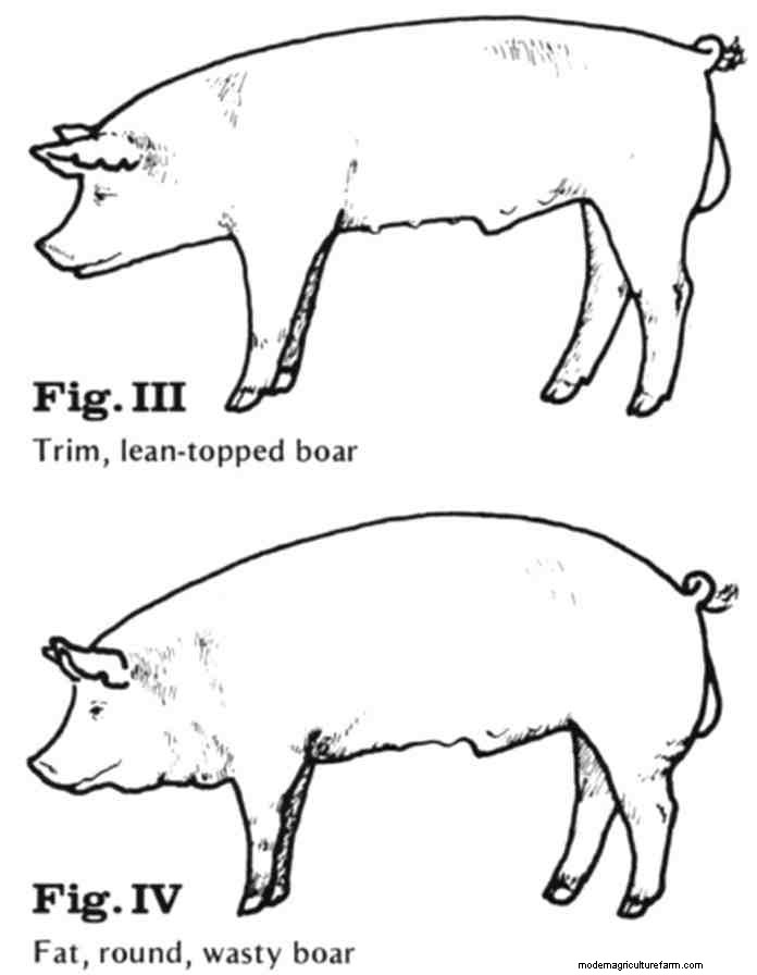 Since fat is neither economical to produce nor trim off the carcass, the selection of lean breeding stock is important. Boars and gilts should be clean over their loin edge; their shoulder blades should be easily seen, and they should be free from the excessive waste in the cushion of their hams. Backfat probes and ultrasonic instruments are useful tools in determining fat. Figures 3 and 4 compare a trim, lean topped boar with a fat, wasty one. Notice the clean-patterned boar has evidence of muscle and skeletal expression, while the wasty one is smooth and lacks expression.