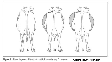 Bloat treatment depends on the type of bloat and its severity. There are three degrees of bloat: mild, moderate, and severe (see illustration above). Treatment for bloat is relatively straightforward, but it should involve your veterinarian if at all possible. While a veterinarian should treat the animal, the farmer should immediately remove the cow from its feed.