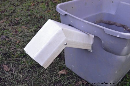 First, prepare the bin. Using a utility knife, cut a hole on one of the narrow sides of the tote box near the handles, preferably toward the top of the bin. This is where the gutter or pipe will sit. The pipe will need to be at a 45-degree angle, so test its slant before making the cut. The reason for this angle is that the prepupae will be able to climb up easily, while the larvae in the organic matter won’t, keeping them feeding below.