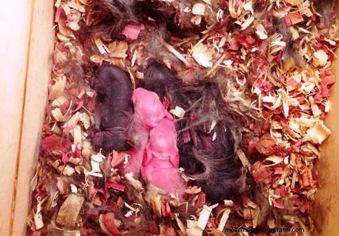 No sooner had we completed their food and water set up in the brood room, when the barometric pressure dropped and the weather turned bitter cold. The first seven kits were born, and six survived their first night. The following morning the other doe had her six kits; five survived. This time, the does made a nest of their own fur and covered the babies. Except for removing the two dead ones, we were careful not to handle them to avoid any abandonment by the moms. So far, so good.