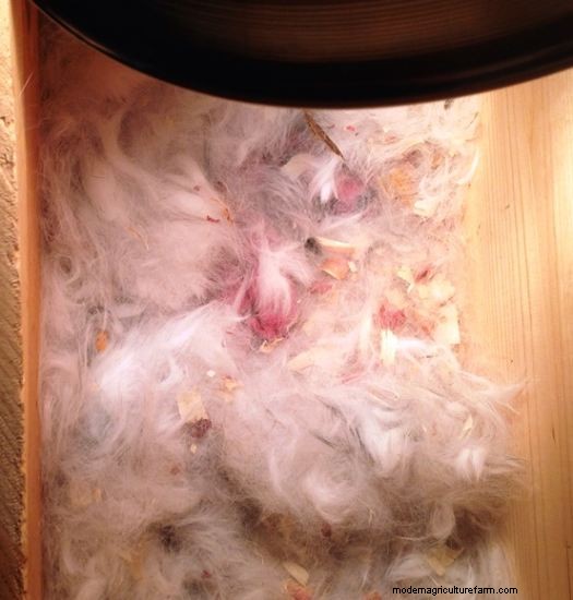 Since does don’t stay in the nesting box to keep their kits warm like mother hens, we set up brooding lamps over the nesting boxes and will keep vigil on the babies to make sure they are getting fed by the mamas. Hopefully, they will instinctively nurse them and teach us a little more about rabbit husbandry. Our last attempt to bring in the new kits and warm them up came too late and somehow the mamas seemed to know there was no hope and didn’t try to nurse them. We bought kitten milk replacement and tried to nurse them ourselves, but none of them survived. We also found out (the hard way) they don’t always pull their hair out to make a nest. Poor babies!