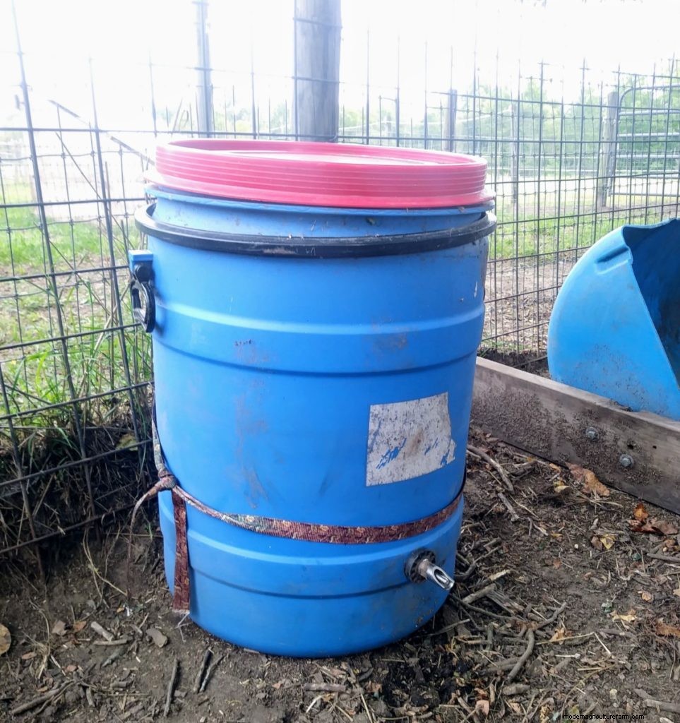 As with all livestock, American Guinea Hogs require constant access to fresh water. Some people supply it in water tanks or even kiddie wading pools. What works best for us are food-grade water barrels outfitted with a pig nipple waterer. This lets the pigs access their water when needed and prevents them from making it filthy.