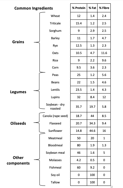 Protein is generally provided by a mixture of legumes, oilseeds and protein meals. While legumes are a good source of cheap protein, they have a high fibre content. Oilseeds provide protein and essential fatty acids, but too much fat can cause health issues.