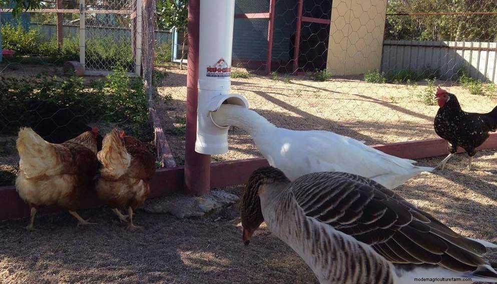 Ducks and Geese have fun as they play in their water. This also includes drinking water. Such wetness and damp is not ideal for chickens. Nipple drinkers are better but waterfowl must also have enough water to fully immerse their heads in order to remain healthy. You can use a