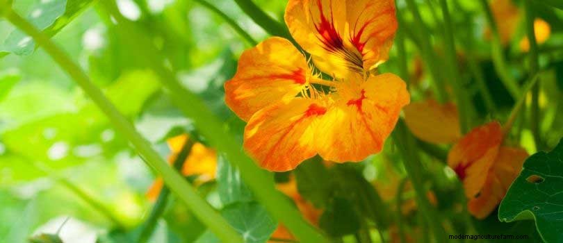 Nasturtiums are beautiful flowers to have around the yard or chicken coop. Once established, a large patch of Nasturtiums plants will be very hardy. They can even stand up to chickens free-ranging in it.