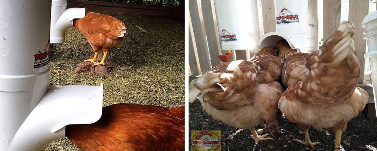 Dine A Chook is the original and number one Pipe Style feeder in the market. Over ten years ago, we invented what has become the world's most advance tube feeder for chickens. Genuine Dine A Chook is 100% Australian Made. We don't cut corners and use cheaper Chinese manufacturing. When you buy Dine A Chook you get the best in Australian Quality and support Australian jobs. We use the latest technology advancements in ASA plastics together with patented custom fittings to achieve what others simply can't.