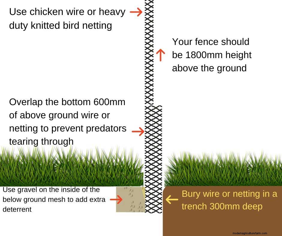 Heavy-gauge galvanised chicken wire and heavy-duty bird net is great for this purpose. Do not use standard light gauge chicken wire as a fox or dog can rip through it. Galvanised heavy gauge chicken wire is made to prevent rust. Start by outlining the boundary of your chicken run. You should position vertical posts at 1.5 - 1.8 metre intervals. Once in place, dig a trench a minimum of 300mm down. Place your first run of lower wire/netting down to the base of the channel and then secure to vertical posts. Backfill the outside of the trench with the lose soil you have excavated. Use rubble or 20mm gravel to backfill inside as a further deterrent to stubborn predators.