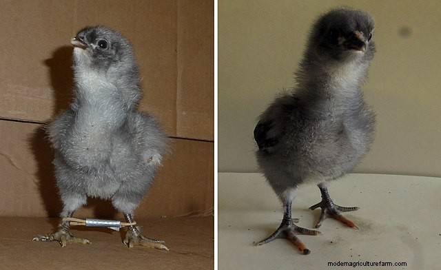 Treatment for splay leg: a brace holding chicks legs in position under their body. Wikimedia Commons