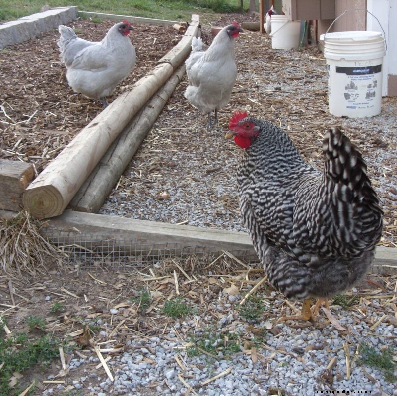 To reduce mud in wet weather, we added fine gravel to the pen to improve drainage. The exposed hardware cloth is a puncture hazard; sharp edges should be removed or covered. Photo by author.