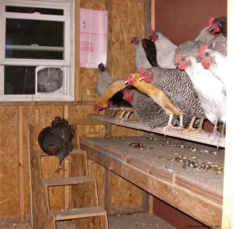 This Barred Rock hops down the steps from the roost. Some hens will fly directly to the ground, which might cause injury. Photo by author.