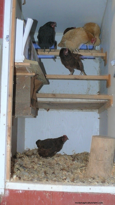An adult hen roosts on the coop floor, isolating herself from the flock. Photo by author.