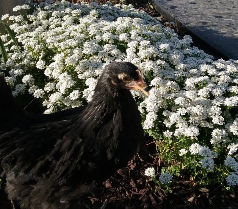 A young chick admires the spring-flowering alyssum in an ornamental bed. A mulched bed provides a cover for earthworms and other insects. Unsupervised, chickens can ravage a garden in minutes. Photo by author.