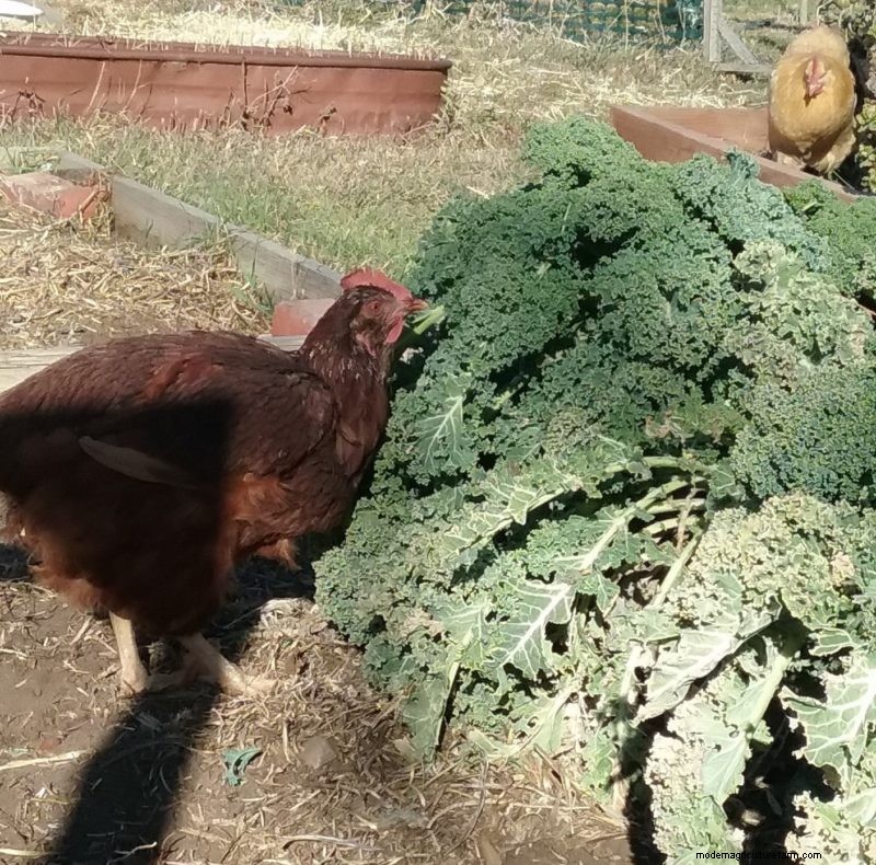 After several years of fighting to keep my chickens out of my gardens, I finally called a truce. Now I plant a few veggies for the chickens in my raised beds, and I fence around what I don’t want them to eat. They love kale and Brussels sprouts (and the accompanying cabbage worms!). I used to enclose my tomatoes in fencing, but now I just let them eat the bottom fruits, and I pick the higher fruits they can’t reach for myself. I also vine my cucumbers so that they can’t get into the inside of the fence, and let them peck at the fruits on the outside of the fencing. Everyone’s happy.