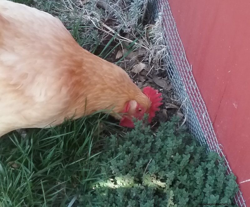 Goldie is snacking in the herb garden outside the coop. I also pinch off some sprigs of thyme and lavender for their nesting boxes. Photo by author.