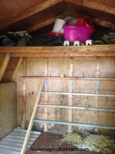 Ok, everything is all cleaned, now what? Once the coop is all dry I place calcium carbonate (agricultural lime or gardening lime) and Diatomaceous Earth (DE) on the floor to deal with odors and keep down mites. I also apply DE at the bottom of the nesting boxes before I replace the bedding. Hang the clean roost bars and BAM a sparkling clean coop you shall have.