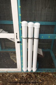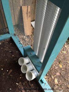 Two of the three PVC tubes hold feed, while the third contains grit and oyster shell. Install the feeders through the protective wire so the openings are accessible to your chickens yet covered by a roof.