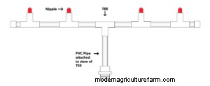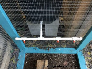 5 – Starting with the TEE, cement a 4-inch section of PVC pipe to each side. Attach another PVC tee to the open end of the 4-inch PVC pipe. Dry fit and then cement a nipple to the stem of those TEE sections. Add as many more horizontal connections as you want for your small flock. Dry fit a 2-inch PVC pipe to either end, cement everything in place, and cement hubcaps onto each horizontal end.