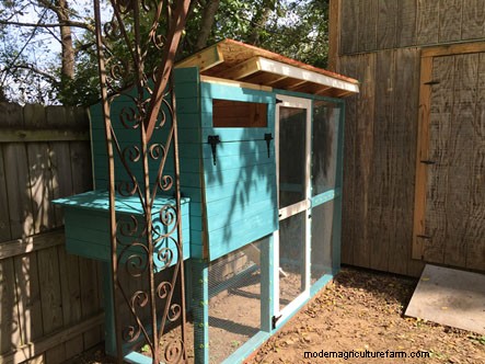 In-progress photo of this custom-built coop shows a raised design and a fully-opening front, both of which help make cleaning out the old bedding fast and easy.