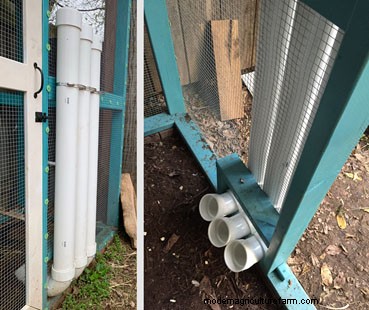 Three homemade PVC feeder tubes attached to the coop/run are ideal, and can be easily built with a couple of 3-inch pipes cut to 3 or 4 feet long, some elbow joints, and pipe caps to protect the feed from rain. Install the feeders through the screen of your coop and they’ll keep the food safe from squirrels and other critters while remaining accessible to your chickens, even in bad weather. Use two feeders for chicken feed; each can easily store 20 pounds or more. Use the third one for a mix of grit and oyster shell. This setup will comfortably feed a flock of 3 to 4 for several weeks, or even longer if they’re occasionally free ranging.
