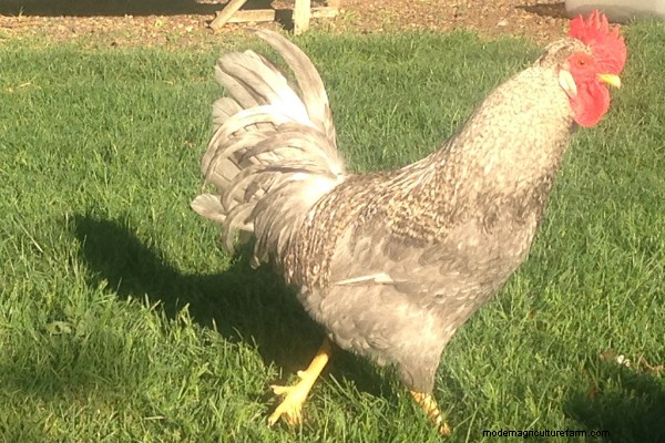 A legbar rooster, exhibiting light grey coloration with barred saddle area