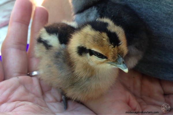 A day-old female legbar – notice the “chipmunk” stripes on her back