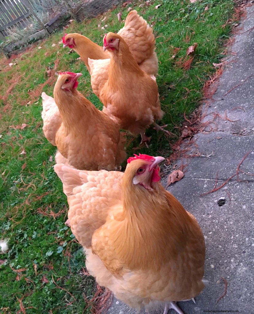 My new flock was a delight. I spent hours in the backyard admiring them. By sitting quietly in a chair and holding out a grape, I trained them to eat from my hand. This process sealed my status as their ‘rooster’, provider of food and protection, and forever after they would run to greet me when I came out the back door. They started laying large, brown eggs when they were around 24 weeks old. They followed my husband and I around the yard, always curious to see what we were doing, did an excellent job shredding and breaking down leaves and grass clippings for our compost pile, and delighted us with their antics. My first flock is no longer with us 3 years later (that is a story for another blog post), but after this experience I knew I was a confirmed urban chicken keeper.