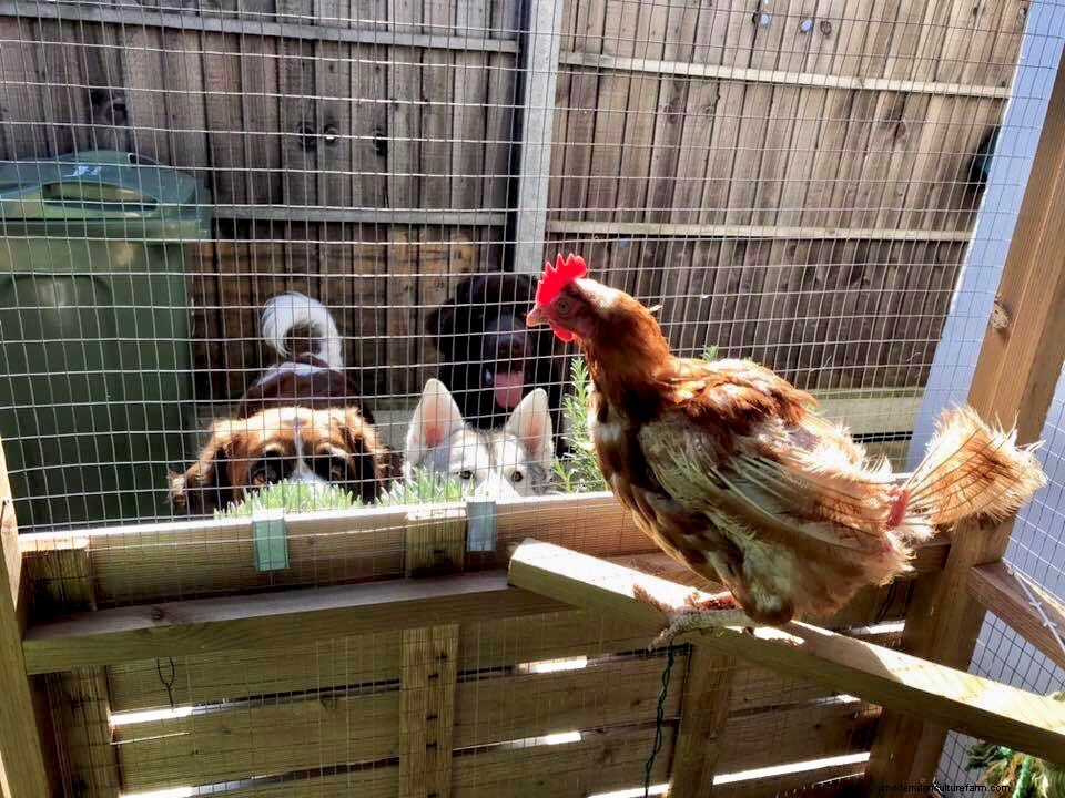 Chickens rescued from industrial farms probably haven’t met many animals of a different species. If you have other animals, you will want to introduce them all slowly and safely.
