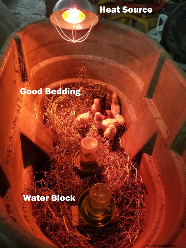 The most important thing about your container is that is draft free. You can use a large cardboard box, a large tote, or a self-made wooden box. Anything that is large and sturdy will work. You want to have enough room for your chicks and a food and water dish. It’s also important to have enough room so the chicks can get away from the heat source if they need to. Personally, I use a retired 100-gallon water tub for my brooder. After a hard freeze created a crack in the bottom it didn’t hold water any more, but it works great as a chick brooder.