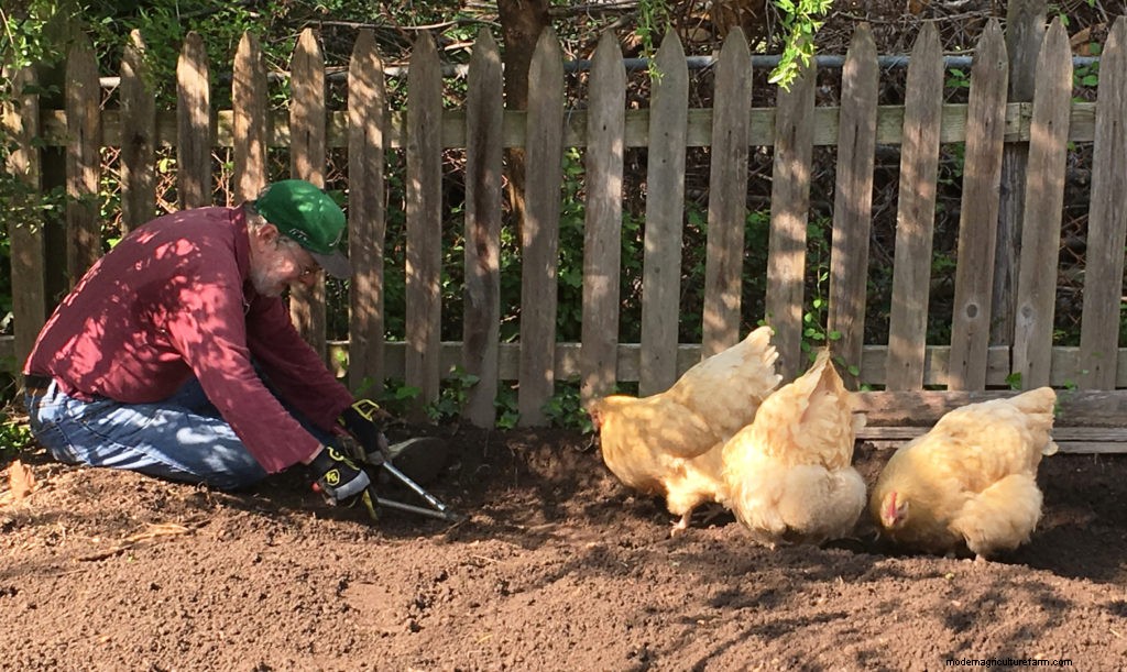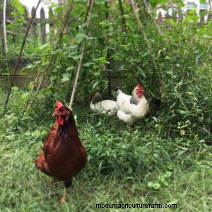 ___ An interesting environment: Hens are active, curious birds and mine are constantly foraging and exploring. The chicken yard includes areas of sun and shade, small trees, shrubs and rocks to walk around or climb on, and a regular supply of grass clippings to scratch through. My husband also devised a moveable fence to direct the chickens to changing areas of pasture. This means that the hens mow most of the lawn!