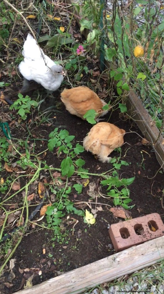 Let them out to free range over your beds and they will help till them over, break down plants that have finished for the year and clear the soil of insect pests, seeds, larvae, and eggs. Reward them for their hard work with a few leafy greens or Brassica that you leave to bolt at the end of the season.