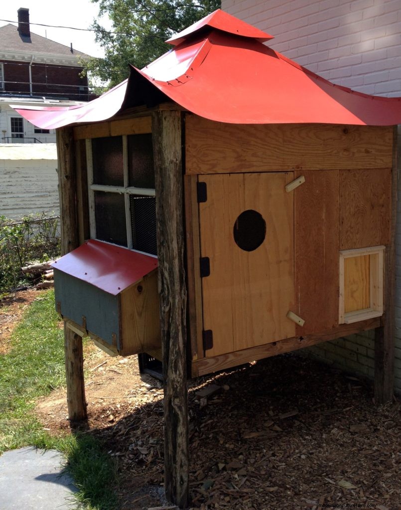 Frank and Chris’s Hentopia coop with a red metal pagoda roof and exterior next box. Photo by author.