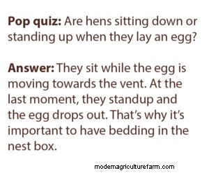 Sometimes hens may need a little encouragement to start laying eggs in a specific place, even in the best nest box. Put a ceramic or a plastic Easter egg in the nest boxes. Even a golf ball will work. Your hens will believe that some other, smarter hen chose that nest as a safe place to lay her eggs. Chickens have a culture of “follow the leader.” Sometimes you have to be that leader.