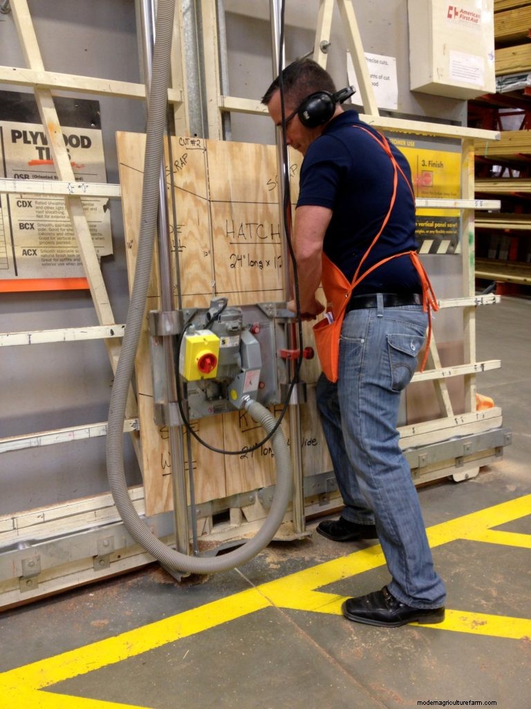 Plywood is challenging to cut, even for professionals. But the big box stores can safely make horizontal and vertical cuts for you with this machine. Often the first two cuts are free. Subsequent cuts might cost 50 cents each. Photo by author.