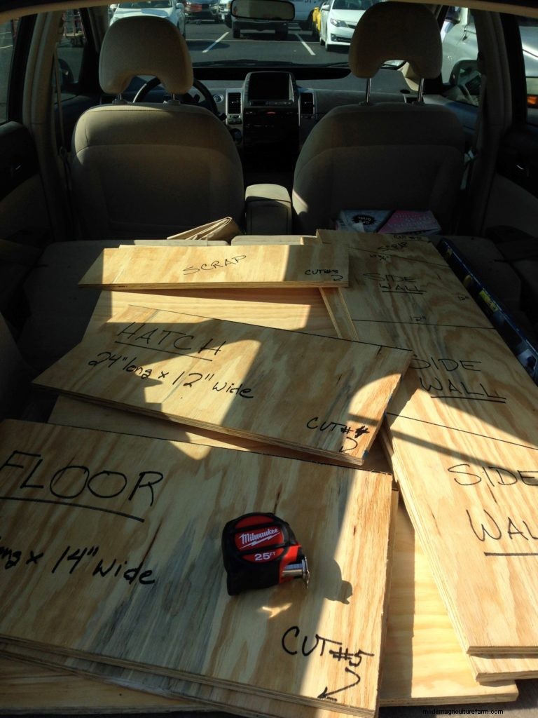 Hens want someplace that’s dark and out of sight from predators. But you don’t want them to be able to roost over the nest box because they will poop in it at night, and the eggs laid the next day will be covered in manure. Each nest box needs to be big enough to sit in comfortably, but also cozy; a 12-by-12-inch cube that is open on the coop side works well. For what we had in mind, we would need to build the side walls, floor and ceiling of the nest boxes while the back wall would be the hatch door. For bigger breeds you might want to go as large as 14 inches and for bantams you may go as small as 8 inches. But many folks keep a variety of hens happy with all boxes built as a 12-inch cube.