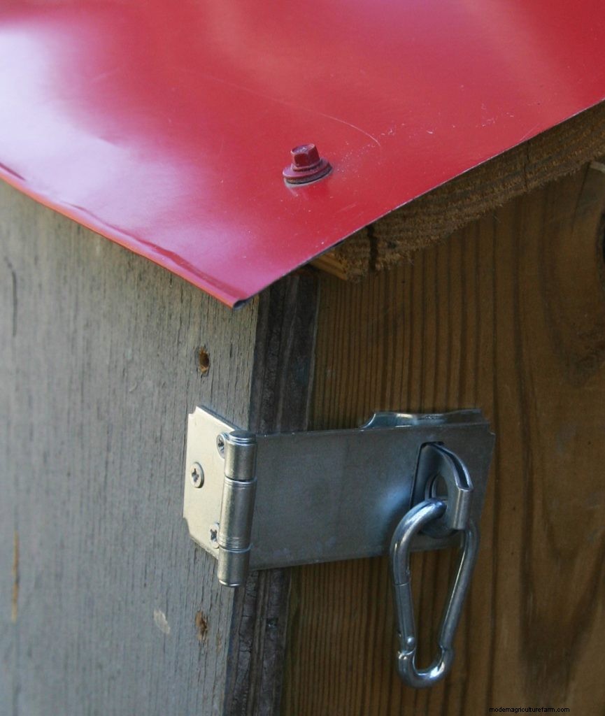 The latches on your hatch have to be secure enough to deter raccoons without making things too inconvenient for hen keepers. Some people have resorted to using padlocks, but I think carabineers are tricky enough to keep raccoons out (or so I hope). The kind of spring-loaded latches commonly found on dog leashes are easy to use too, but some people say they are not raccoon proof. So it’s up to you to decide your trade-off between risk and convenience.