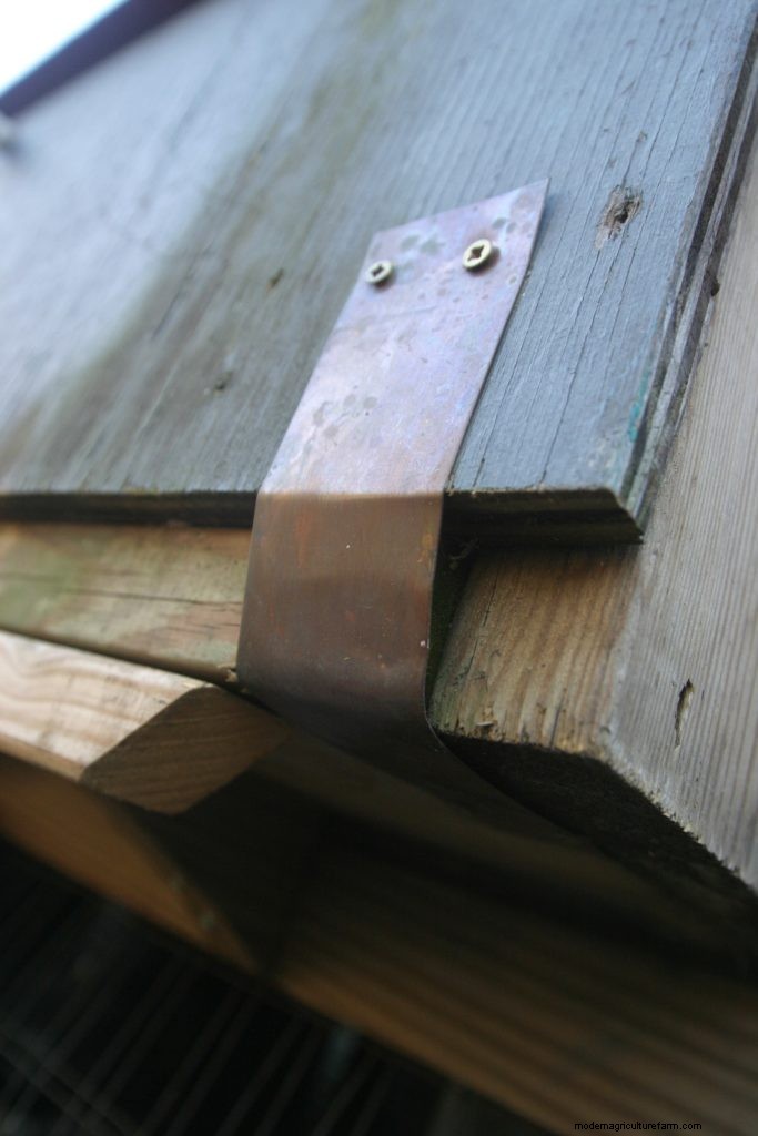 The hatch for our nest box has hinges at the bottom and latches on the sides. You could use gate hinges from the hardware store that are made for outdoor use and won’t get rusty. I saved a little money by making three “country” hinges from a scrap sheet of copper and brass screws (other screws may cause copper to corrode). With scrap sheet metal of any kind, pre-drill a hole in the metal that is wider than the screw’s threads. Then mark and pre-drill a hole in the wood only as wide as the screw’s shaft so everything will be snug. These “hinges” don’t move as smoothly as a gate hinge, but they are cheaper and work well enough.