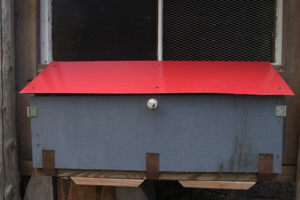 Since the nest box protrudes from the wall of the coop it will need its own waterproof roof. I used a piece of shiny, red, scrap metal on the roof of our nest box. But other roofing options will work too: asphalt shingles, cedar shingles, old license plates, flattened no. 10 cans, a miniature green roof, etc. I recommend thinking of the nest box roof as small-scale but highly-visible opportunity to dress up the coop and give it some charm and personality.