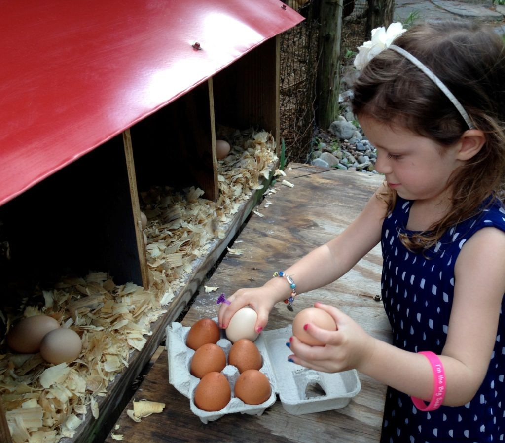 Frank’s neighbor Michaela collecting eggs accessed through the hatch, which can also be used as a convenient surface to load eggs into a carton. Photo by author.
