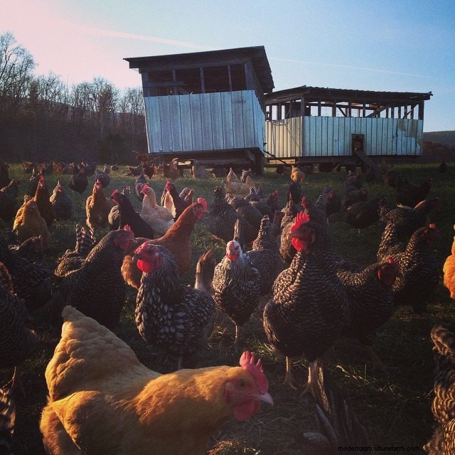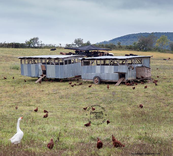 Chicken tractors these days haven’t changed a whole lot. They are larger than the first one, but still made with bits and pieces of what is available. Photo used with permission of Joel Salatin.