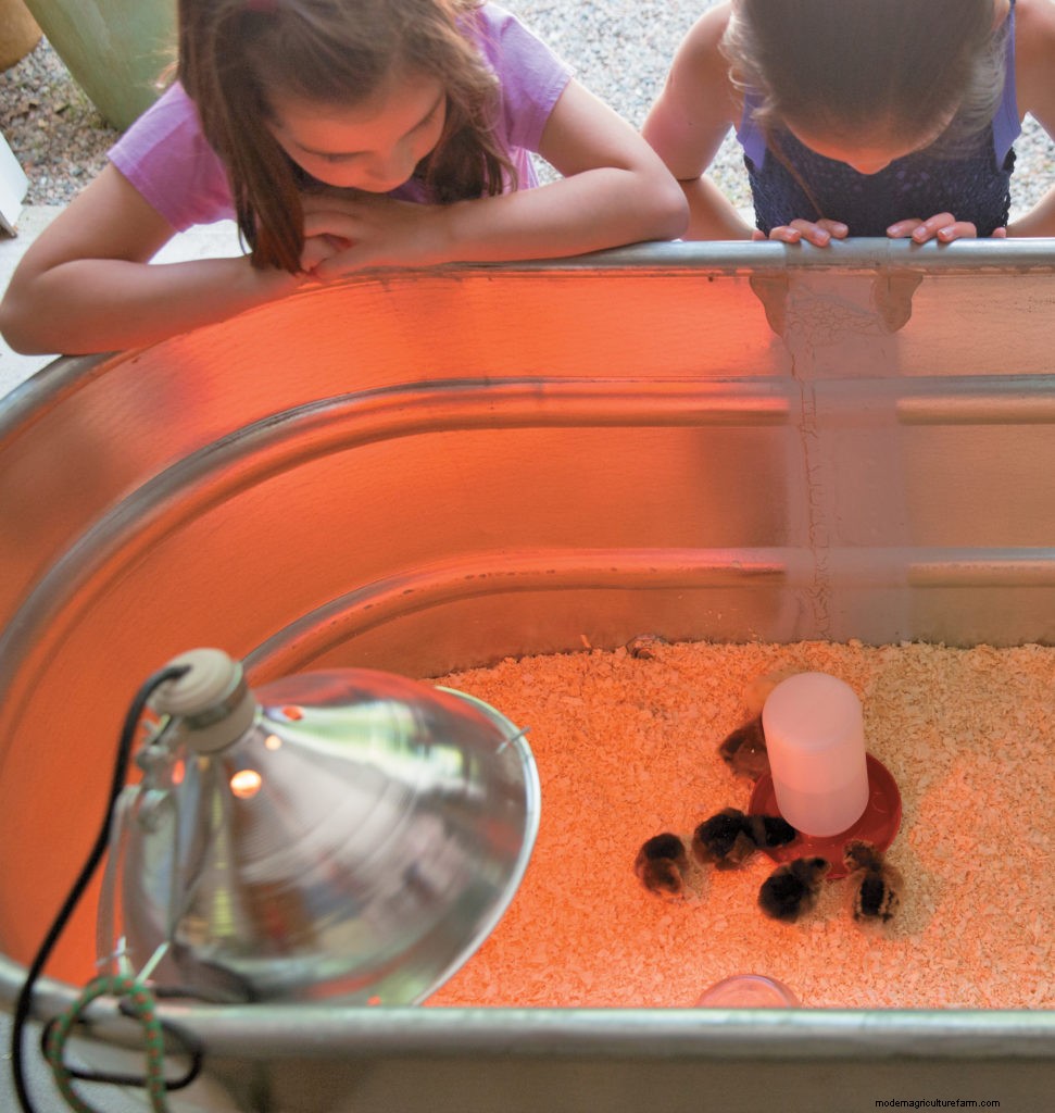 You can make a brooder out of all kinds of materials. Some people cut down a large cardboard appliance box. Some use a big plastic storage bin or an old 20-gallon aquarium (these can be heavy, but they work fine). If your family is handy, you can build one from scraps of lumber. Or you can buy one at a farm-supply store or on the Internet. A cardboard box is the cheapest and often the most convenient container, but always consider the possible risk of fire from the heat lamp.