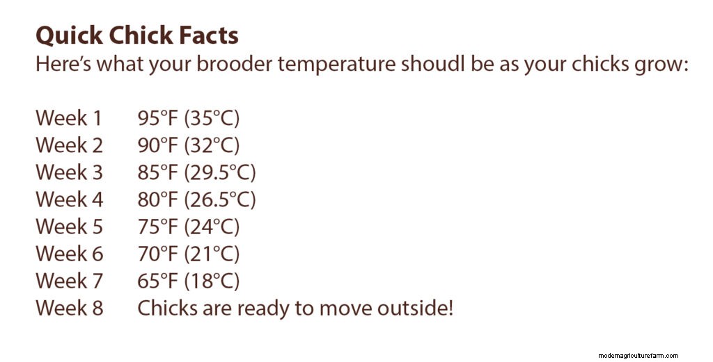 For the first few weeks of life, chicks need to stay very warm without becoming overheated. If the brooder becomes too hot or too cold, the chicks could become ill or stressed, or even die. The temperature inside the brooder during the first week should be 95°F (35°C).