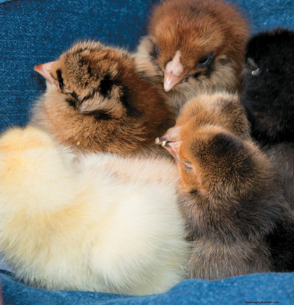 Local feed stores carry an assortment of chick-sized feeders and waterers. See chapter 6 for more information on what chicks need to eat. Chicks make a mess of any type of feeder as they scratch through the shavings and run around the brooder.
