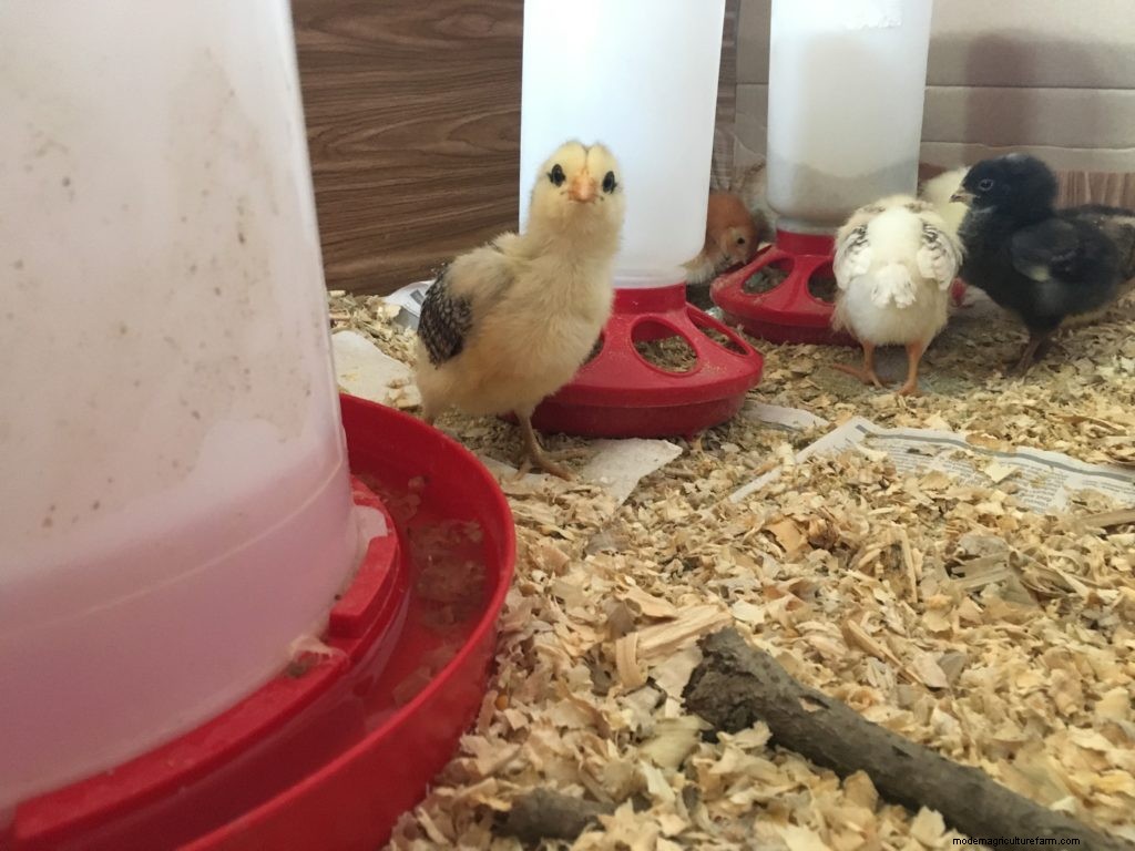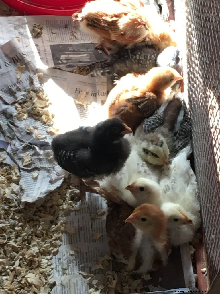 Before plucking two Ameraucana chicks from the pen, the store employee asked, “Light or Dark?” I thought about it for a second and spontaneously replied, “One of each.” I hadn’t expected this choice, but the two little chicks were so cute! The dark one was dark brown with speckles, and the light one had a stripe down her back and was yellow and brown with speckled wings. The stripe made the light one look a little bit like a chipmunk from above – this made me smile!