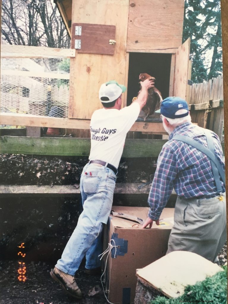 The first coop and first chicken. Matt and his dad, April 2000. Photo by Janelle Wilkinson.