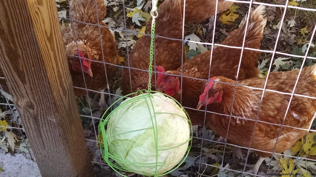 A hanging cabbage serves two purposes. It gives the chickens some healthy greens, and also keeps them busy as they peck at the swinging treat.