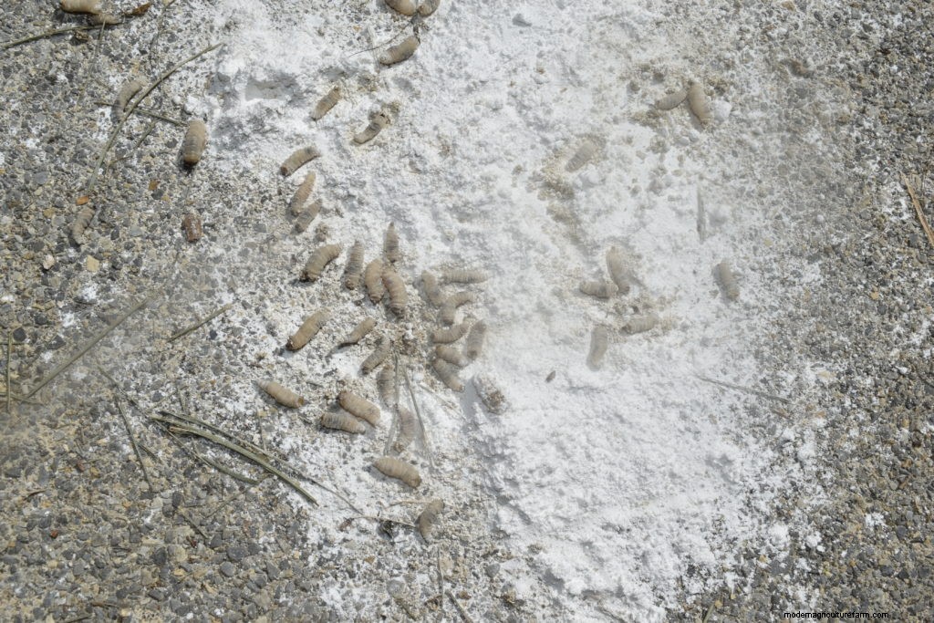 These are the maggots that streamed off Six and died after the author treated her with Prozap Garden and Poultry Dust, a permethrin based product. Photo by author.