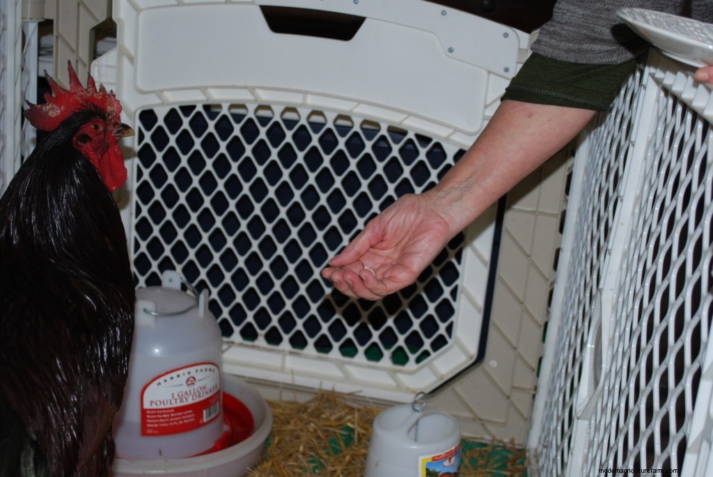 Place a chicken in isolation after it contracts fly strike and give it healthy treats and probiotics. Photo by author.