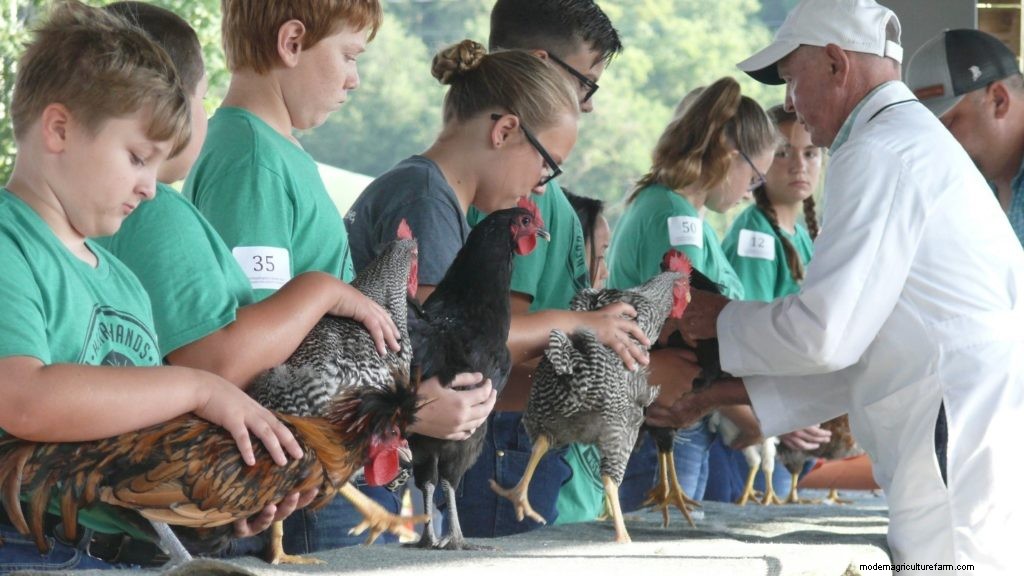 Poultry judging at the county fair, with chickens in close proximity. Photo by author.