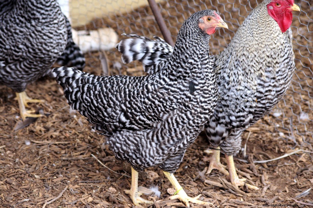Dominique hen and rooster on the left, Barred Rock hen on the right.