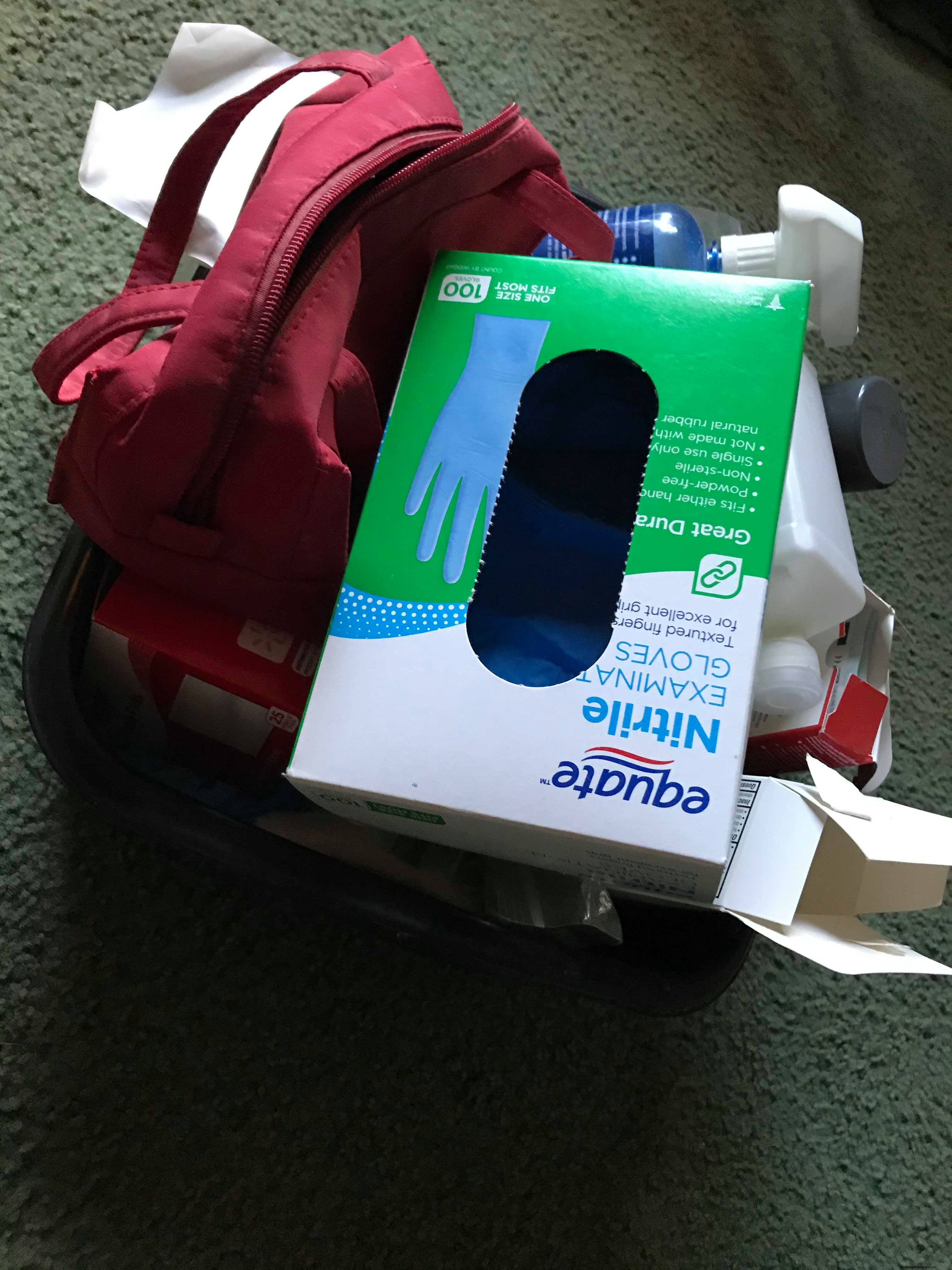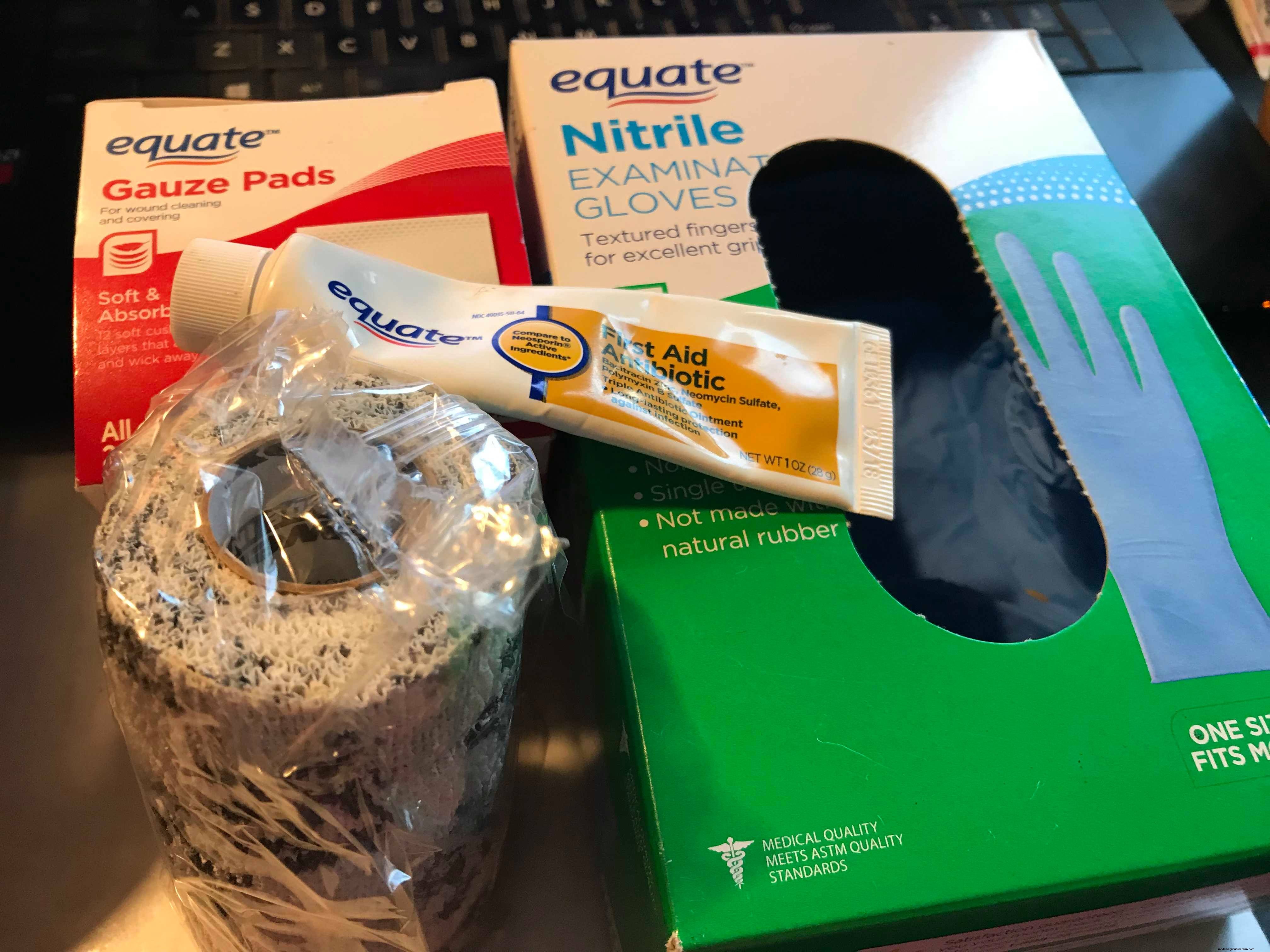 Disposable gloves, antibiotic ointment, gauze, and veterinary wrap are staples of my first aid kit.